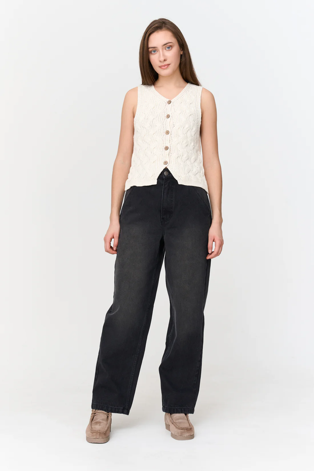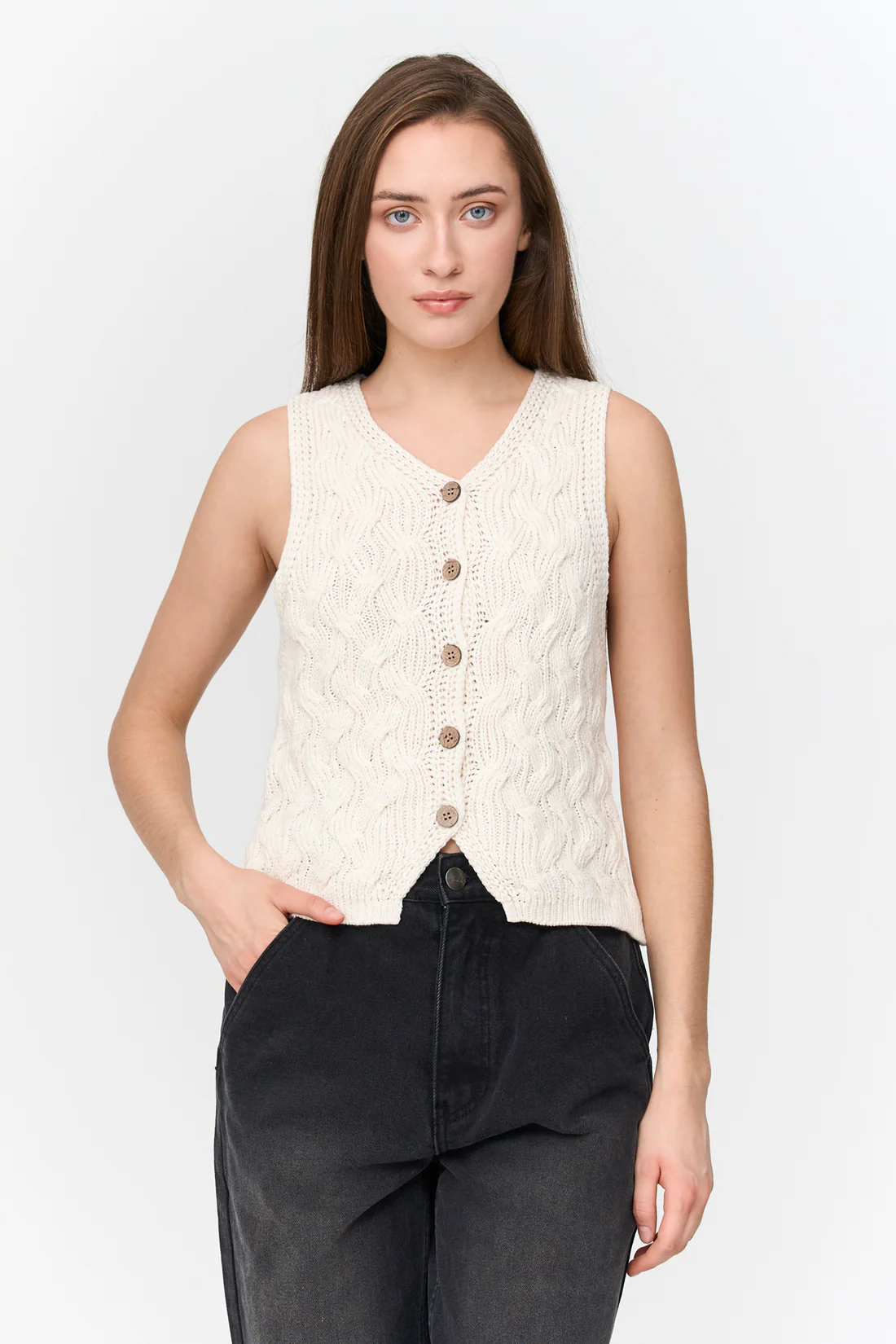 Cozy meets chic with this cream cable knit vest from 24 Colours. Featuring classic cable detailing and a button-up front, it’s the perfect piece to layer over a crisp shirt or wear on its own for an effortless look. Soft, timeless, and easy to style — a wardrobe staple for every season.