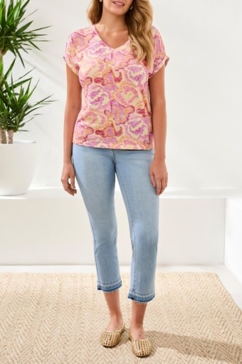 This cap sleeve top offers two styling options—boat neck or V-neck—in soft, printed Hatchi for ultimate versatility. Lightweight and comfortable, it’s perfect for layering or wearing on its own. The premium stretch fabric ensures ease and modern movement for every spring activity.