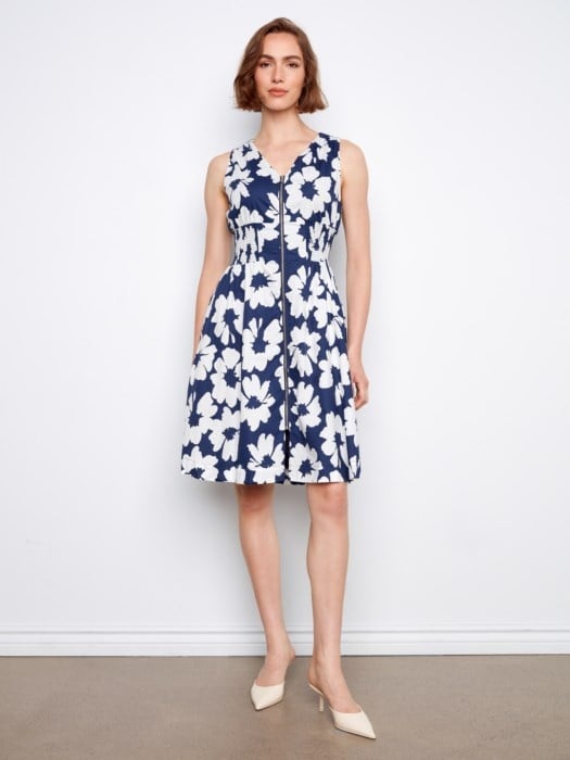 • Cotton Voile Printed Front Zip Knee Length Dress
