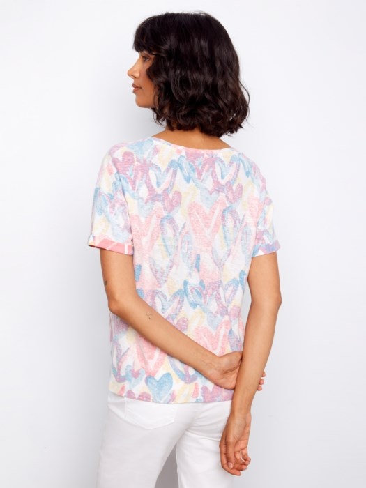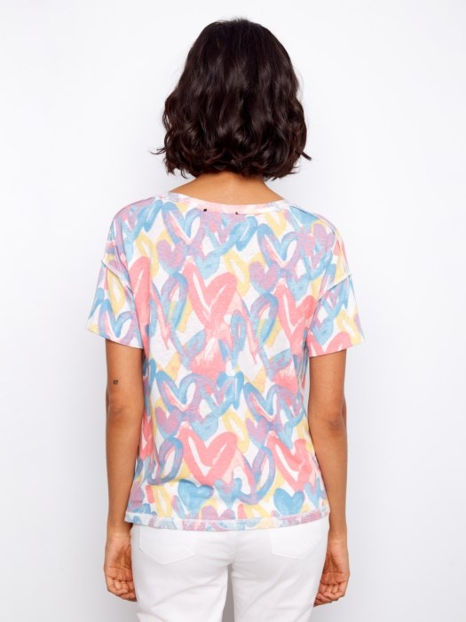Charlie B Printed Short Sleeve V Neck T Shirt W/ Knot Detail C1335Y