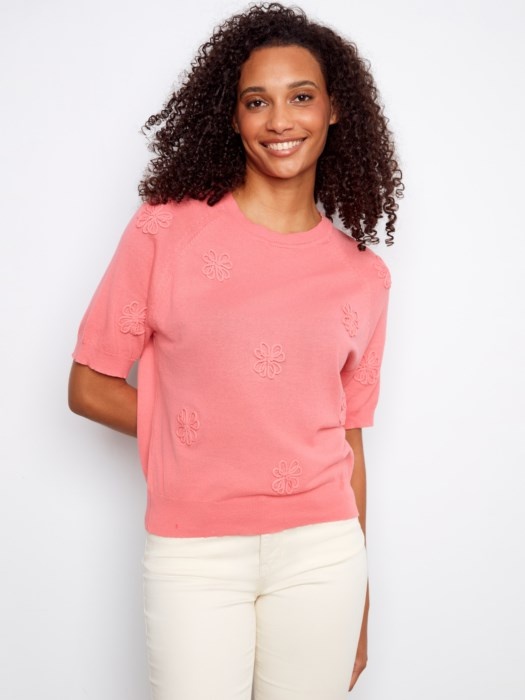 Charlie B Raglan Elbow Sleeve Sweater With Flowers Soutache Detail C2969