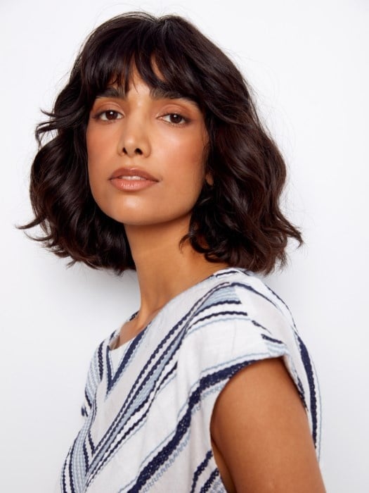 Charlie B Striped Cap Sleeve Round Neck Front Tie Top C4271