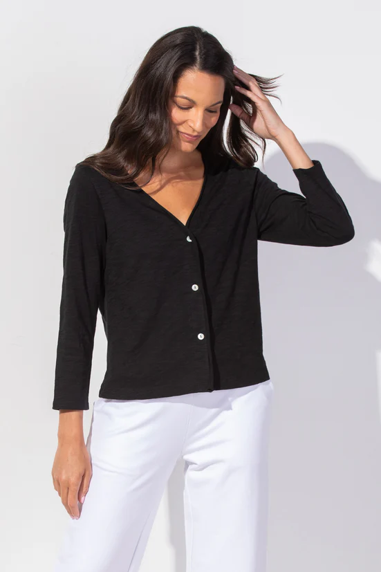 • Rolled front placket, agoya shell buttons, relaxed fit for easy layering. For air conditioned rooms to seaside strolls, this little guy has you covered.