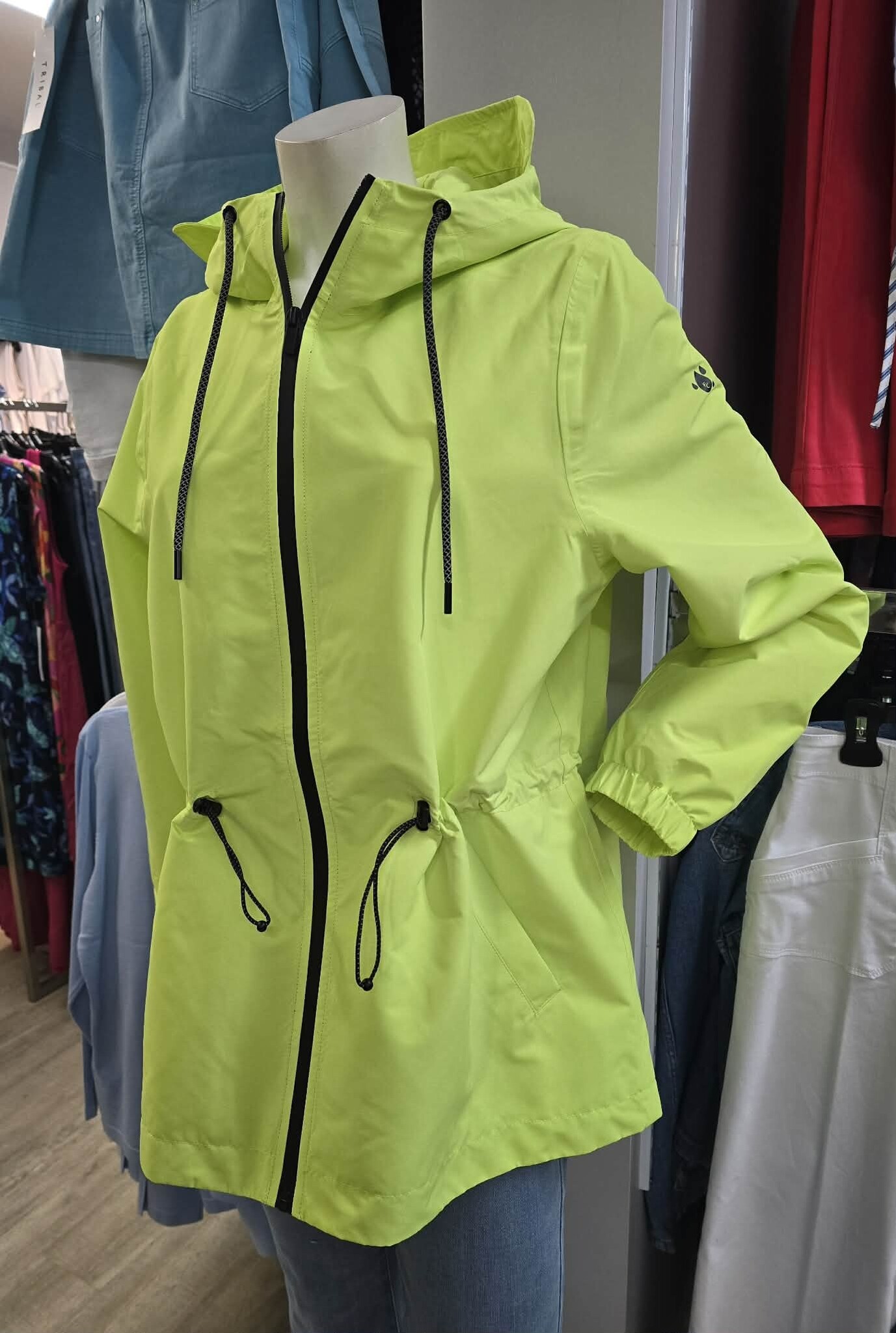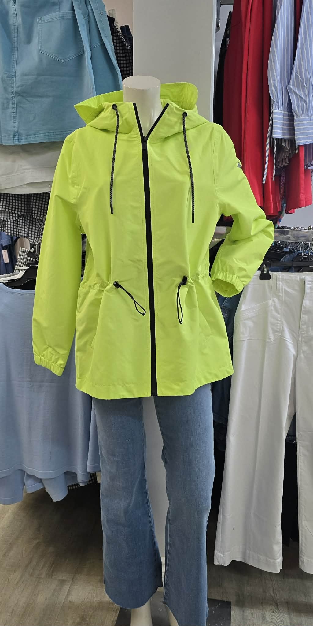 Crafted from lightweight, water-resistant fabric, this jacket is as practical as it is eye-catching. A hood and adjustable toggled drawstring waist offer customizable coverage and shape, while functional pockets keep essentials close at hand.