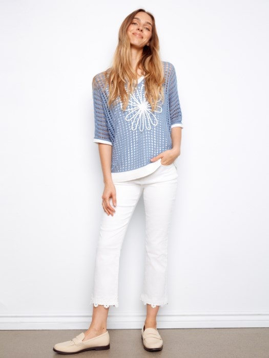 • Fishnet Dolman Elbow Sleeve Sweater With Flower Applique At Center