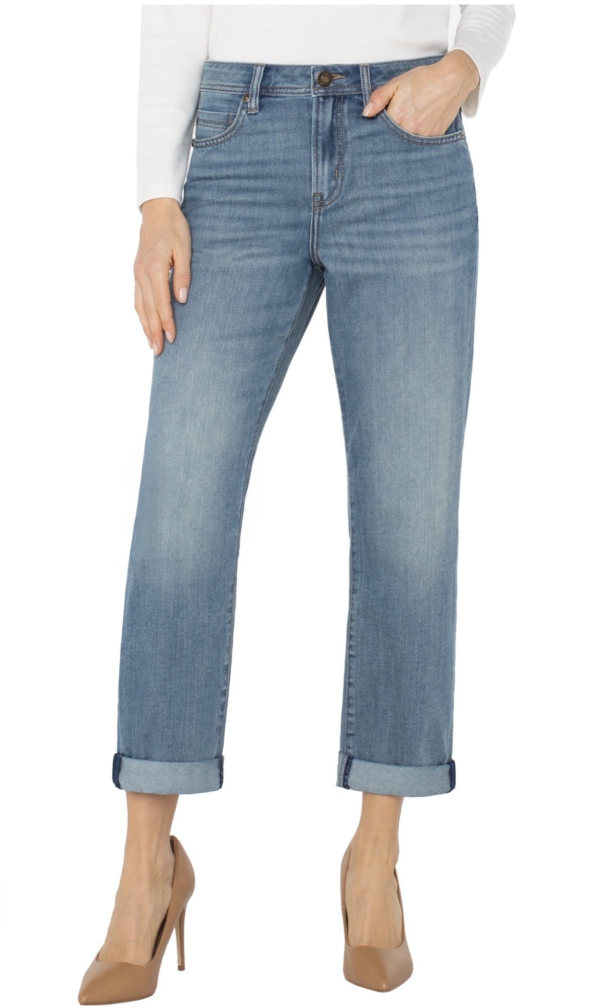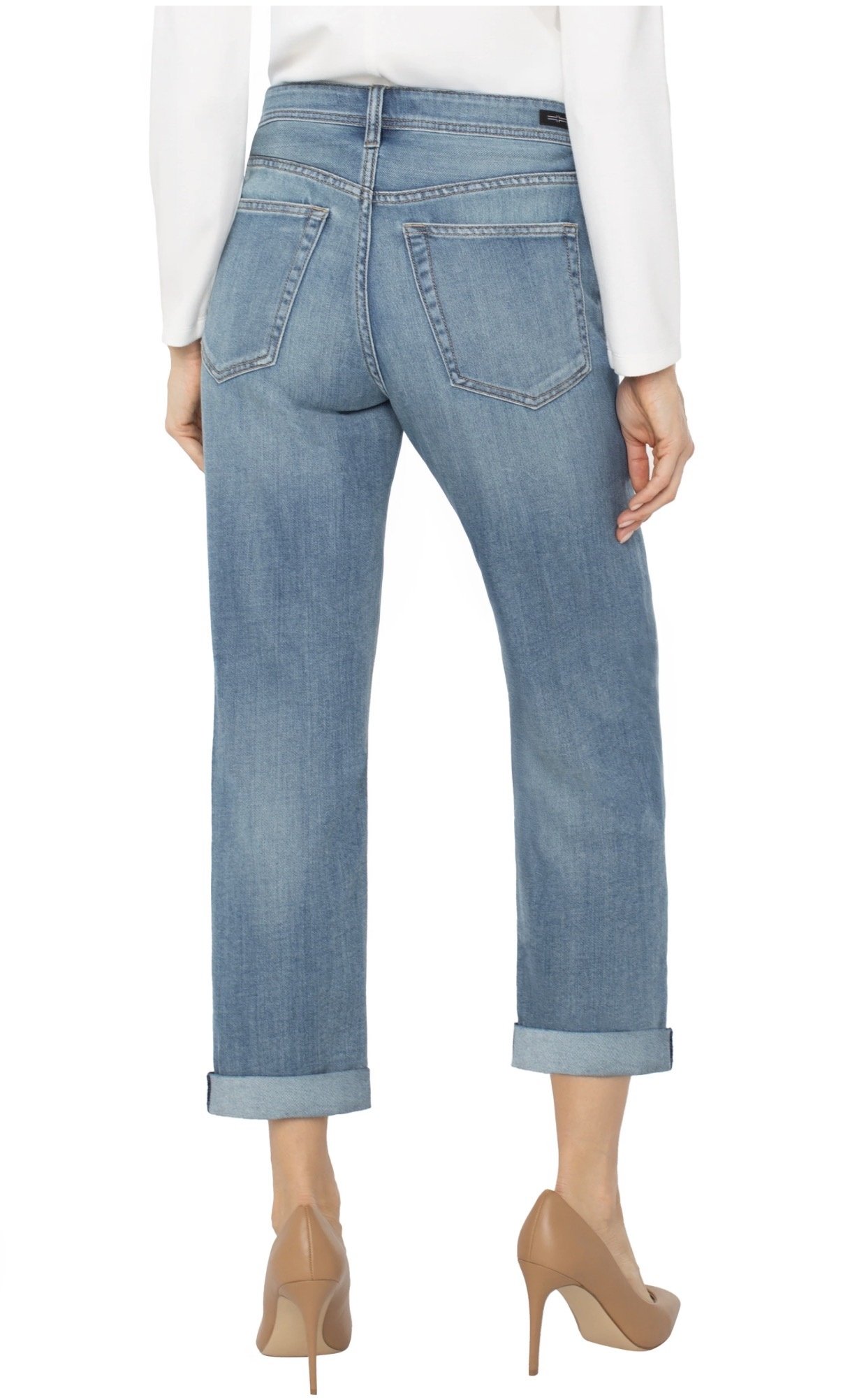This versatile jean is meant to sit low on the hip and is a looser fitting boyfriend jean. This boyfriend jean features vintage like characteristics, is the perfect jean. The rolled cuff adds an extra touch, making these jeans perfect for both laid-back outings and dressier occasions.