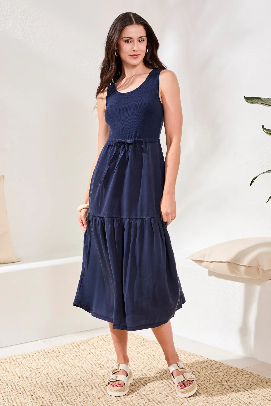 Breezy and refined, this sleeveless dress pairs a softly ribbed knit top with a flowing tiered poplin skirt for the perfect balance of comfort and polish. A self-tie waist defines the silhouette, while its airy movement and minimalist design make it an effortless choice for warm, sunlit days.