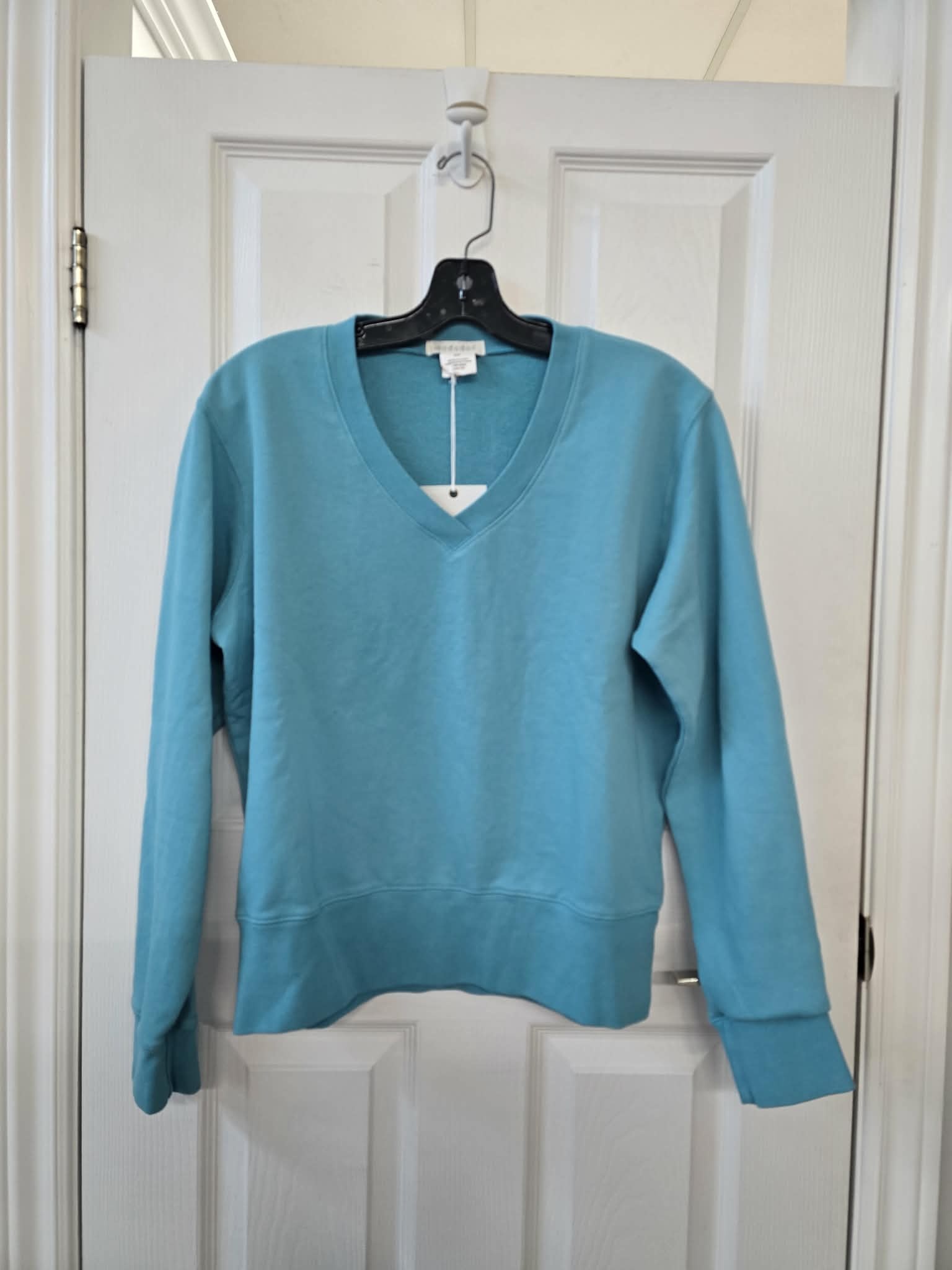 • Cotton v-neck fleece sweater. Ribbed cuffs and hem details. Fits true to size.
