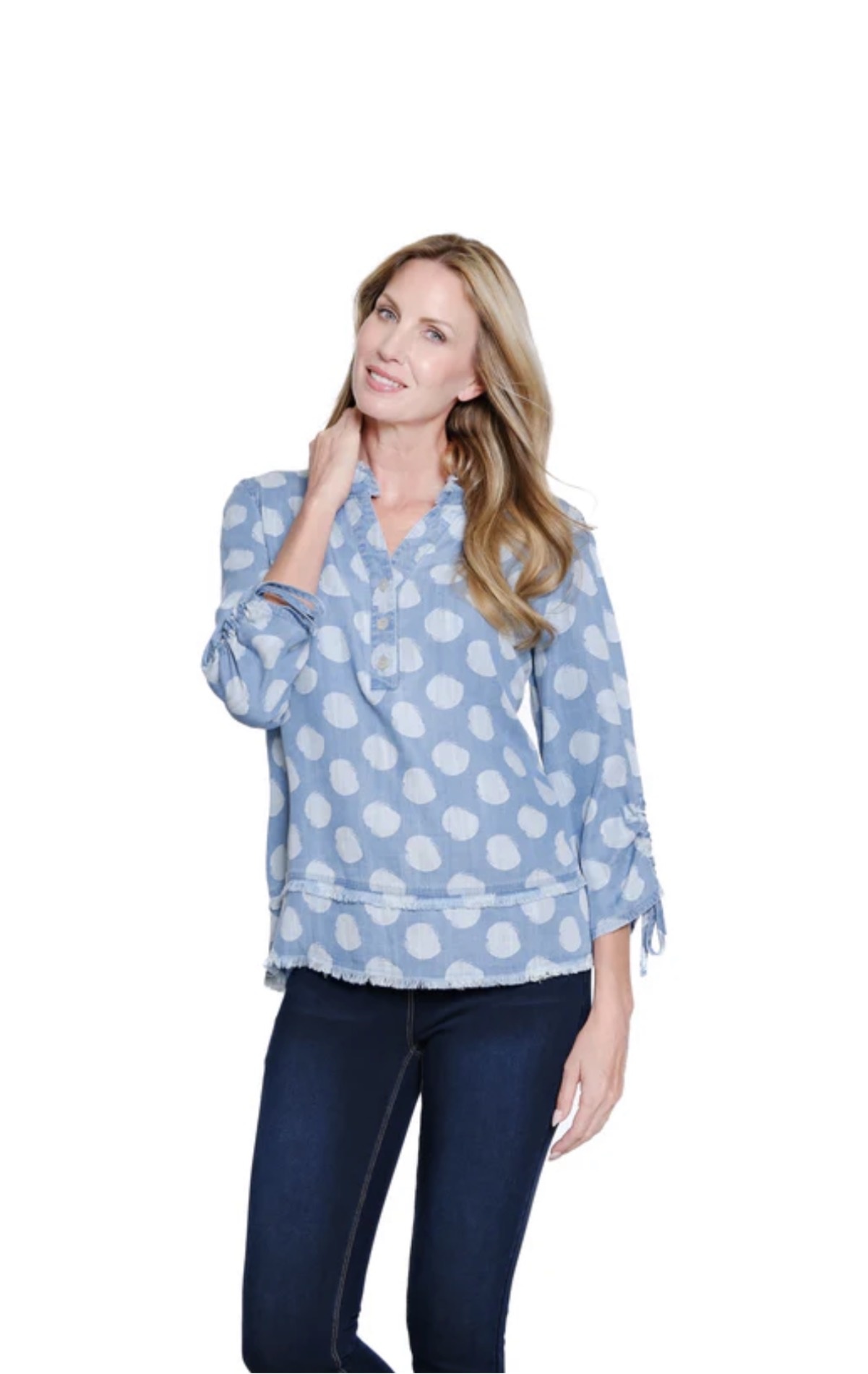 • 3/4-length sleeves with adjustable drawstring detail