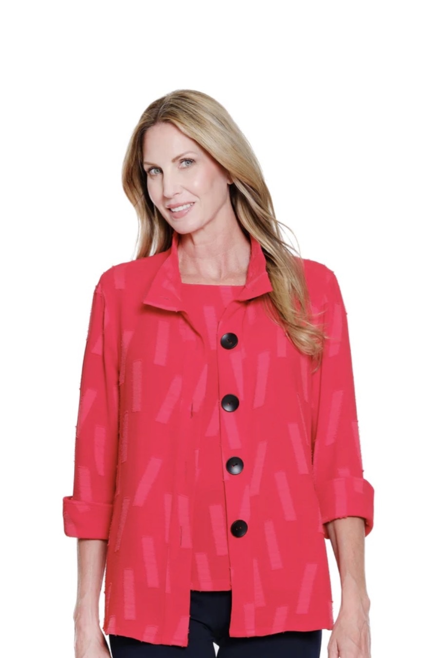 • Thoughtfully designed with soft structure and feminine detail, this textured woven jacket offers polished versatility. A wire collar allows for customizable shaping, while 3/4-length flounce sleeves add graceful movement. Finished with functional side seam pockets and paired with a coordinating tank, this set delivers effortless sophistication in a clean, solid palette. Crafted in smooth polyester, it’s a refined layering piece designed for everyday elegance.