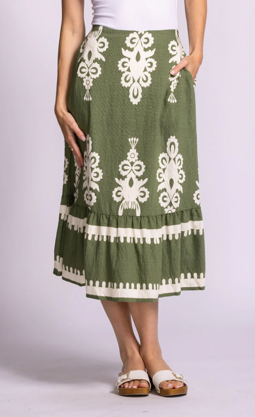 • The Bellingham Skirt is a printed midi skirt with a tiered hem, side seam pockets, and an elasticized back for a comfortable fit. Made from lightweight, breathable fabric, it flows effortlessly for all-day wear. Style it with a tank top or a button-up shirt for an easy, polished daytime look.