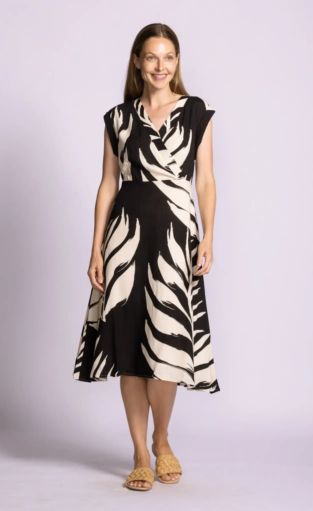 • The Elmer Dress is a printed midi A-line dress designed with an overlap V-neck bodice. Fitted at the waist and gently flares into an A-line skirt, it features a self-fabric tie for an adjustable fit. Style it with sandals for a relaxed daytime look or dress it up with heels for a polished finish.