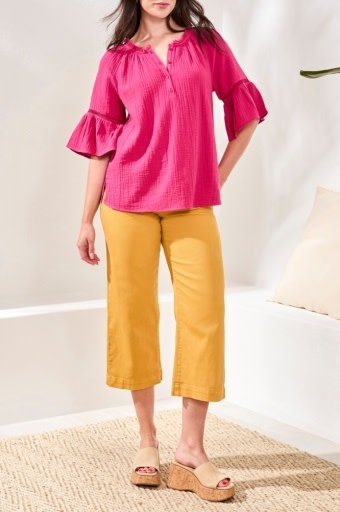 Crafted from softly crinkled gauze, this blouse exudes effortless elegance. A gathered split neckline frames the face with subtle femininity, while flounced sleeves with delicate lace inserts lend a breezy, romantic finish. Light and relaxed, it transitions seamlessly from laid-back days to refined evenings.