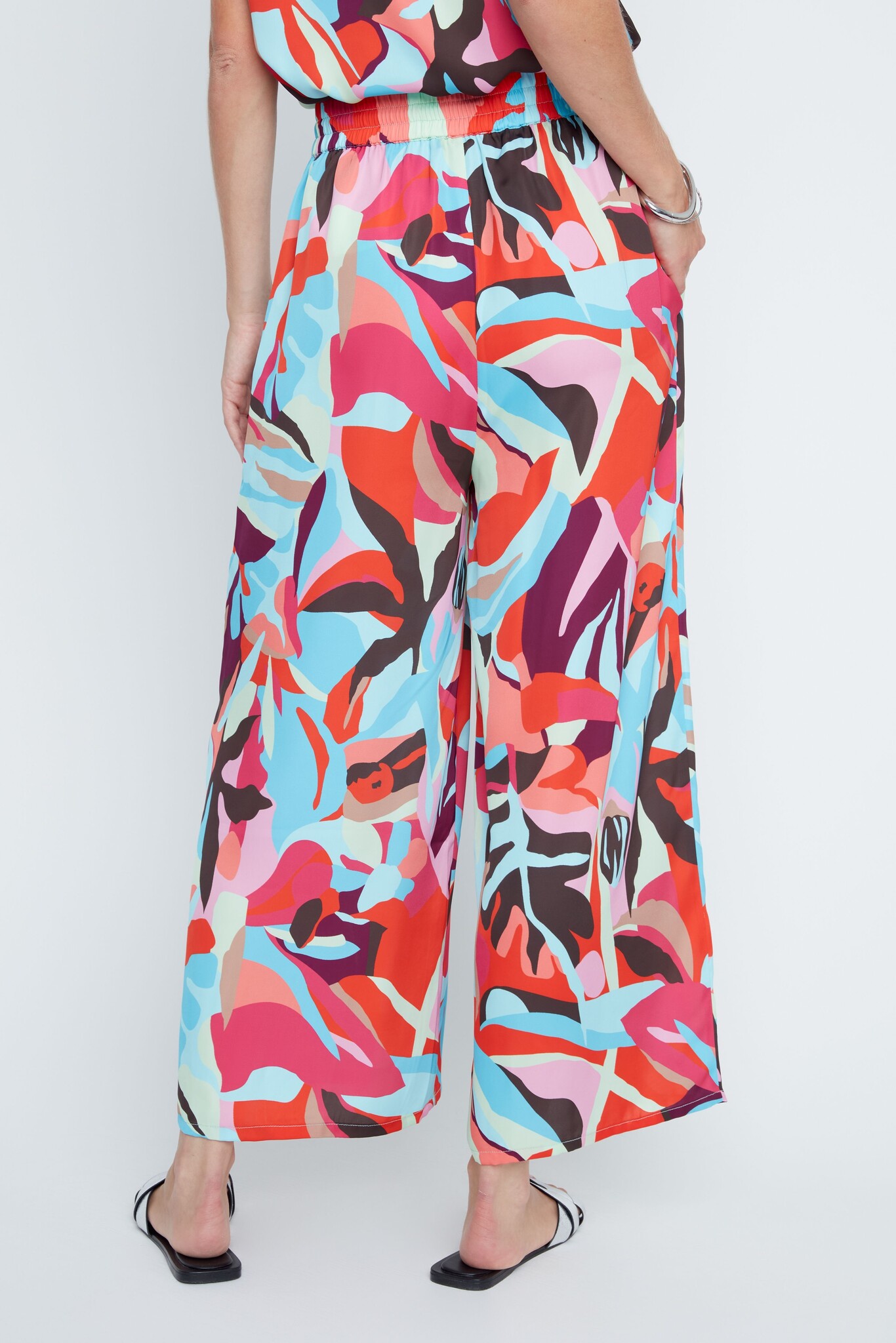 The pull-on waistband with adjustable drawstring offers a flattering, flexible fit, while functional pockets add everyday practicality. The bright tropical print instantly elevates your look—perfect for vacation, patio dinners, or adding a pop of colour to your summer wardrobe.
