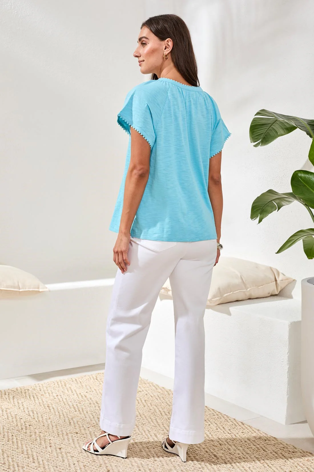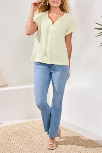 Bring a touch of boho charm with this short sleeve split neck top, finished with a tassel detail. The pure cotton slub fabric offers a relaxed drape and soft touch, keeping you comfortable and cool all season in a range of bold shades.