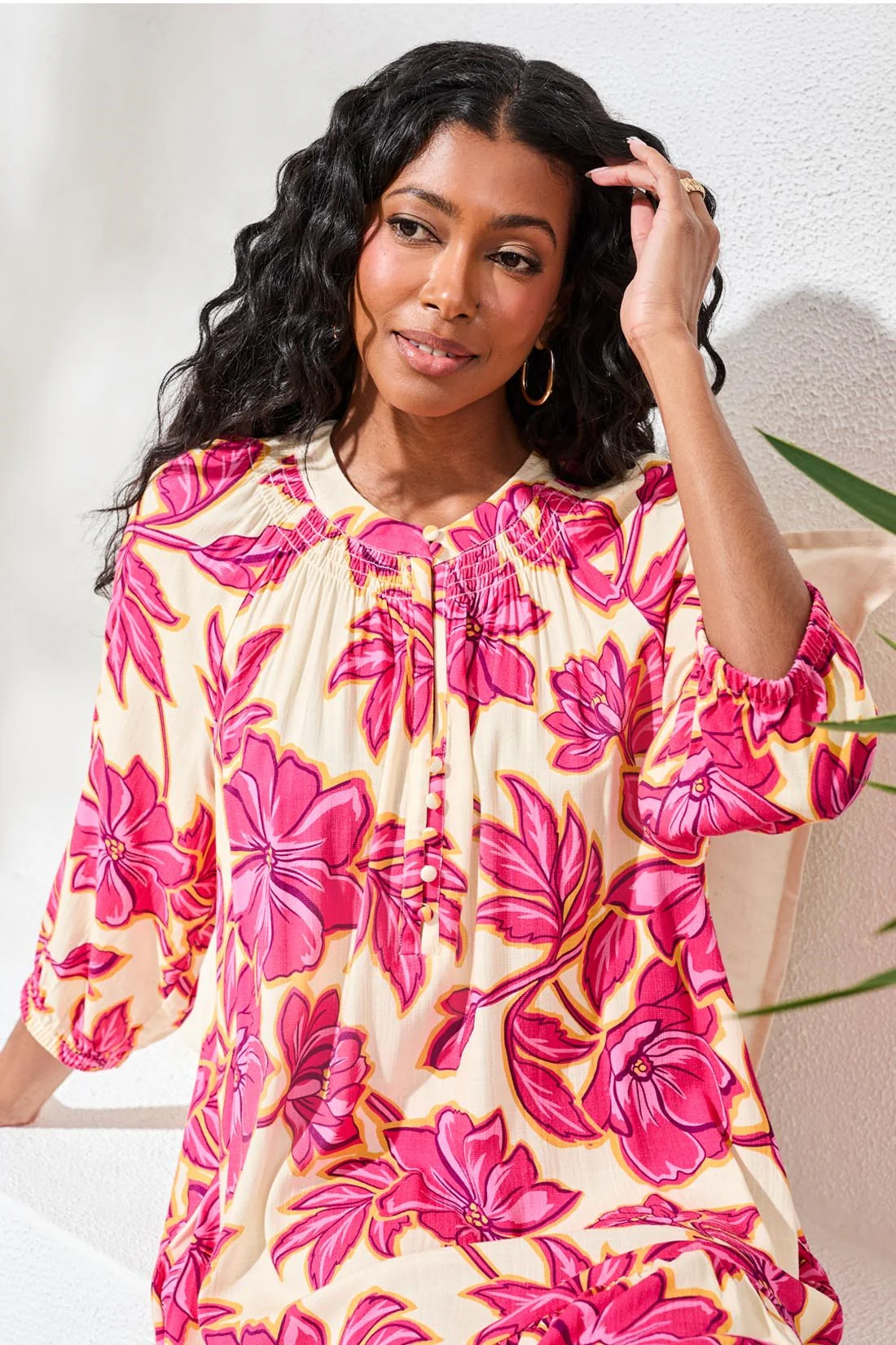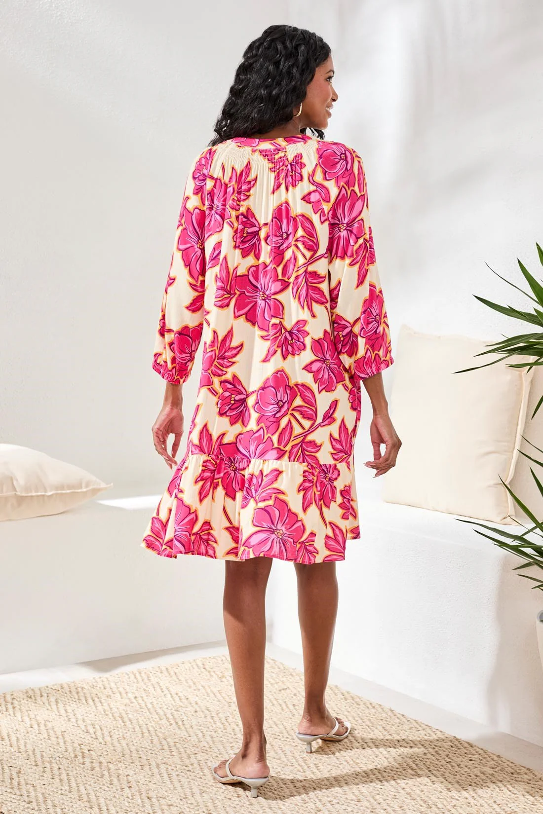 Brighten your wardrobe with this printed crosshatch dress, styled with a button front placket and 3/4 sleeves for versatile appeal. The lightweight woven fabric offers breathable comfort and fluid movement, making this dress an effortless choice for modern, multi-generational style.