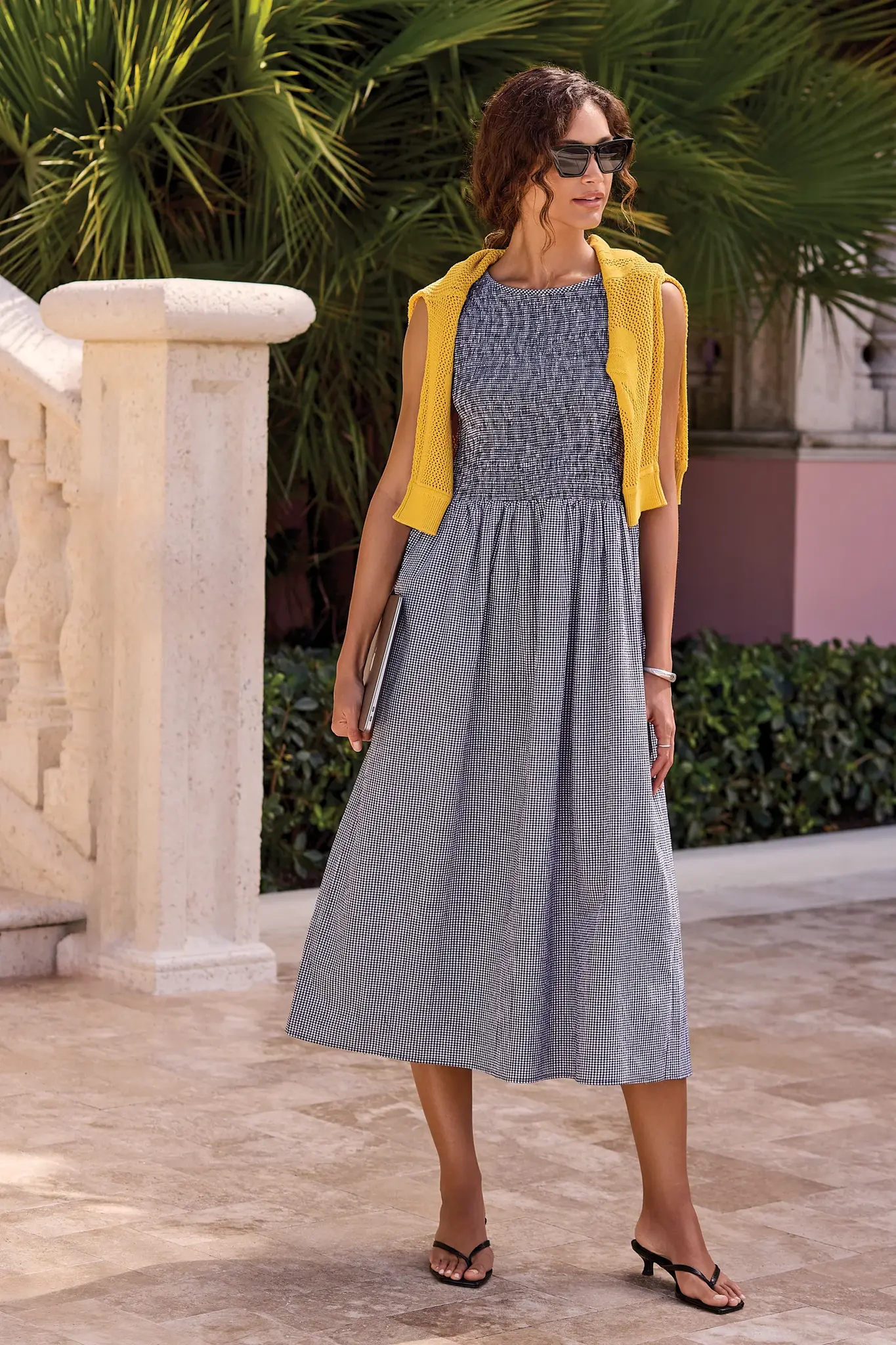 Experience timeless charm in this gingham dress with a ruched top detail. The breezy sleeveless silhouette, soft stretch cotton, and flowing maxi length create all-day comfort. Perfect for warm-weather adventures and effortless style.