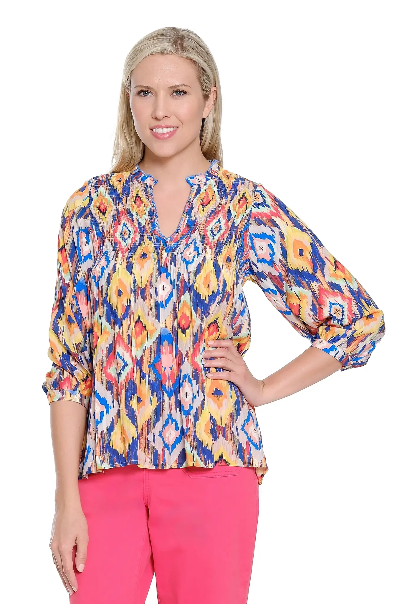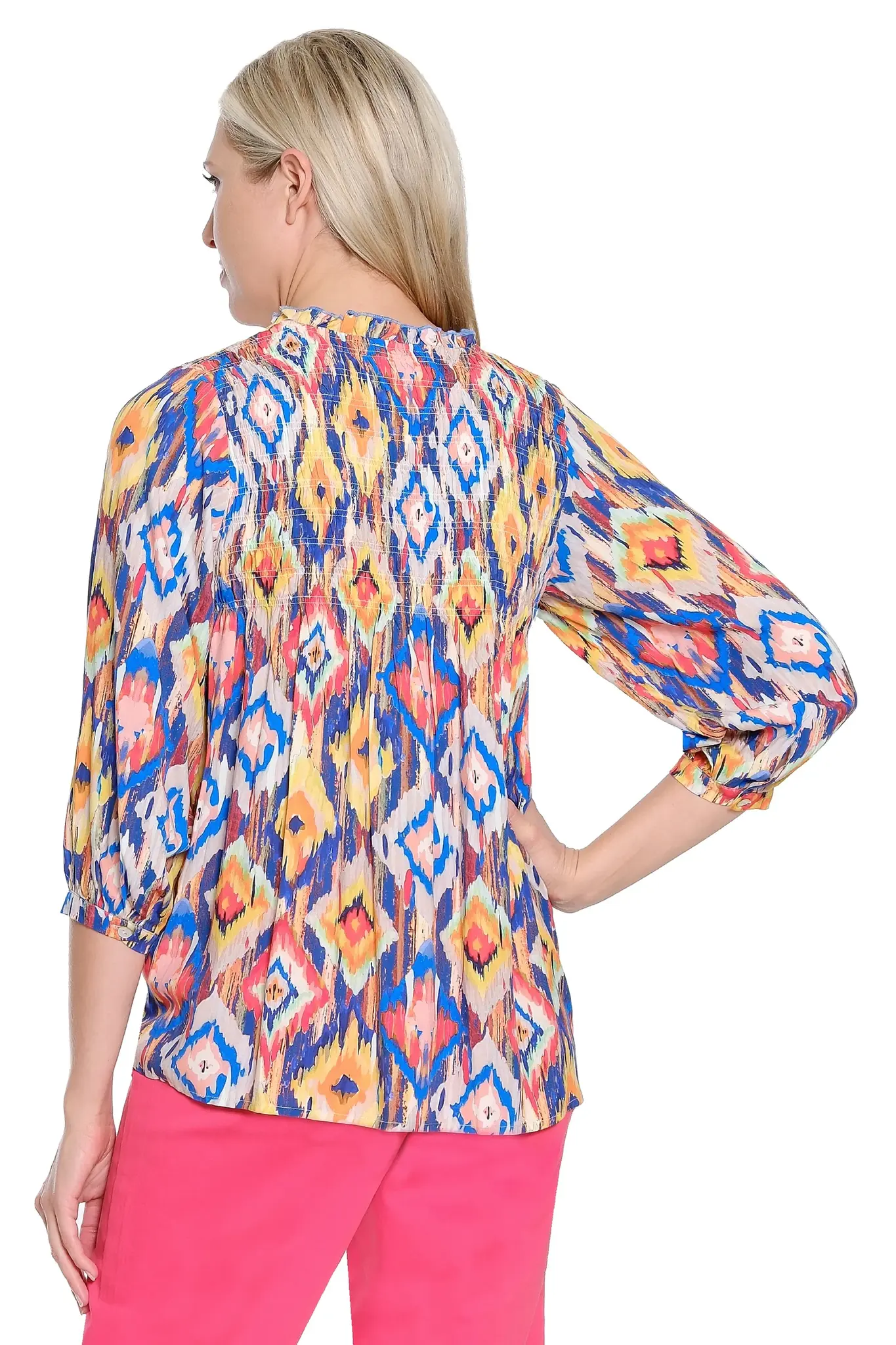 • Softly detailed with smocking at the neckline, this multicolor print top offers graceful texture and feminine charm. The flattering split neck creates an easy focal point, while the 26.5" high point shoulder length provides balanced, comfortable coverage. Crafted in fluid rayon, it drapes beautifully for polished, everyday elegance.