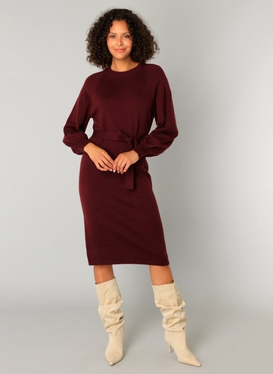 • Description: A comfortable knit dress with stylish details. This dress is knee-length, has balloon sleeves and a removable bow belt that subtly accentuates your waist. The knitted fabric feels cosy and makes this item perfect for autumn. Available in port or black, easy to style with boots.