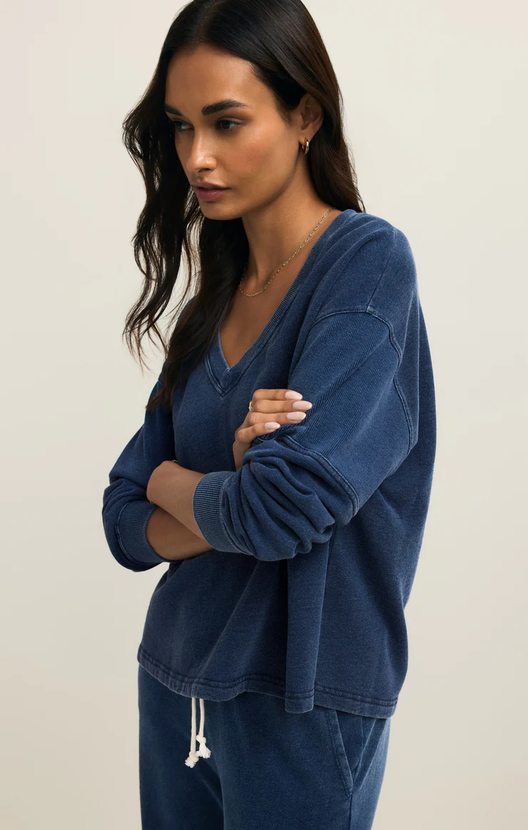 • Soft knit denim gives this v-neck sweatshirt its laid-back edge. The mineral wash adds a perfectly lived-in look that only gets better with wear. With subtle rib details and an easy fit, it’s a relaxed essential that pairs with everything.